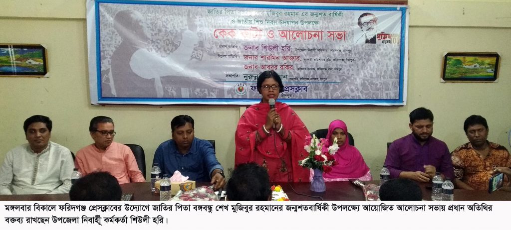 জাতির পিতা বঙ্গবন্ধুর জন্মশতবার্ষিকী উপলক্ষে ফরিদগঞ্জ প্রেসক্লাবে কেক কাটা ও আলোচনা সভা অনুষ্ঠিত হয়। মঙ্গলবার বিকালে প্রেসক্লাবের সভাপতি নুরুন্নবী নোমানের সভাপতিত্বে প্রধান অতিথি হিসেবে বক্তব্য রাখেন ইউএনও শিউলী হরি। এসময় তিনি তার বক্তব্যে বলেন, জাতির পিতা বঙ্গবন্ধু শেখ মুজিবুর রহমানকে জন্মশতবার্ষিকী পালন শুধু কোন উৎসবের মধ্যে দিয়ে পালন করলেই চলবে না। অন্তর দিয়ে পালন করতে হবে। তার প্রতিটি কর্ম এবং আদর্শকে যদি আমরা কাজে লাগাতে পারি, তবেই তা হবে তার প্রতি আমাদের সম্মান দেখানো। তিনি বলেন, আজ আমরা এখানে দাঁড়িয়ে বক্তব্য প্রদান করতে পারছি, তা শুধু মাত্র ওই লৌহ মানবের সারাটা জীবনের পরিশ্রমের কারণেই । তিনি তার কর্মজীবনের প্রতিটি মূহূর্ত বাঙ্গালি জাতির জন্য দিয়ে গেছেন। তার তার আত্মত্যাগের বিনিময়ে আজ আমরা স্বাধীন দেশের নাগরিক। আজ আমরা সরকারি কর্মকর্তা। তাই আমাদের সকলের উচিত নিজ নিজ কর্মক্ষেত্রে আরো নিষ্ঠাবান হয়ে দেশের মানুষের জন্য কাজ করা। তিনি শিশুদের খুব বেশি ভালবাসতেন। তাই তার জন্মদিনটিকে জাতীয় শিশু দিবস হিসেবে ঘোষনা করেছে সরকার। আমরা চাই আমরা এমন একটি বাংলাদেশ গড়বো, যেই বাংলাদেশ হবে শিশুদের জন্য সুখময়। আর তা যদি আমরা সফল ভাবে করতে পারিম তবেই আমরা সোনার বাংলা গড়তে পারবো। আমাদের সবার মনে রাখতে হবে লৌহ মানব জাতির পিতা বঙ্গবন্ধু শেখ মুজিবুর রহমানের জম্মে কারনেই আজ আমরা স্বাধীন সোনার বাংলাদেশ পেয়েছি।