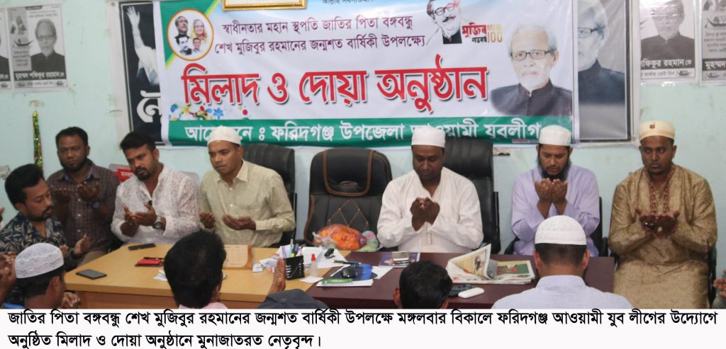 জাতির পিতা বঙ্গবন্ধু শেখ মুজিবুর রহমানের জন্ম শতবার্ষিকী উপলক্ষ্যে মঙ্গলবার বিকালে ফরিদগঞ্জ উপজেলা আওয়ামী যুব লীগের উদ্যোগে মিলাদ ও দোয়া অনুষ্ঠিত হয়েছে। উপজেলা যুব লীগের সিনিয়র যুগ্মআহ্বায়ক হেলাল উদ্দিনের সভাপতিত্বে এর আগে অনুষ্ঠিত আলোচনা সভায় বক্তব্য রাখেন পৌর সভার কাউন্সিলর খলিলুর রহমান, সাবেক উপজেলা যুব লীগের আহ্বায়ক বিল্লাল হোসেন পাটওয়ারী, যুব লীগ নেতা মাকসুদুল বাশার বাঁদন পাটওয়ারী, আওয়ামী লীগ নেতা নজরুল ইসলাম সুমন