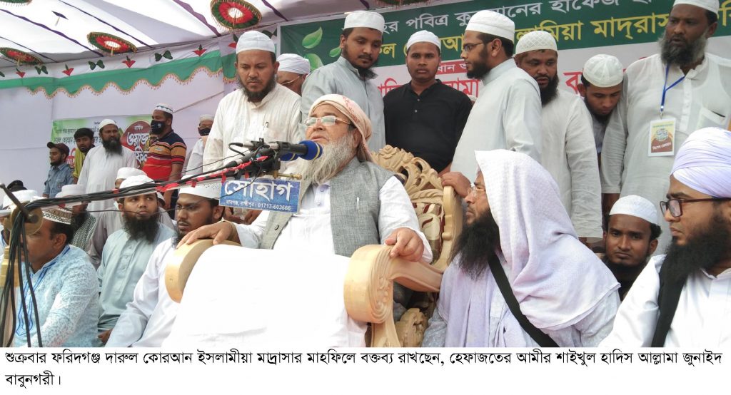 গতকাল শুক্রবার বিকেলে ফরিদগঞ্জ দারুল কোরআন ইসলামীয়া মাদ্রাসার উদ্যোগে ৩য় বার্ষিকী ওয়াজ মাহফিলে, হেফাজতে ইসলামের আমীর শায়খুল হাদিস আল্লামা জুনাইদ বাবু নগরী তিনি তাঁর বক্তব্যে এই কথা বলেন।