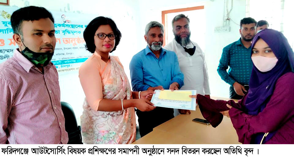 চাঁদপুরের ফরিদগঞ্জ উপজেলা পরিষদের আয়োজনে, যুব ও ক্রীড়া উন্নয়ন কমিটির বাস্তবায়নে ও স্থানীয় সরকার বিভাগ ও জাপান ইন্টারন্যাশনাল কোঅপারেশন এজেন্সী (জাইকা)’র সহায়তায় বেকার যুবক-যুবমহিলাদের আত্মকর্মসংস্থানের লক্ষে ফ্রিল্যাংন্সিং ও আউটসোর্সিং বিষয়ে সক্ষমতা বৃদ্ধিমূলক প্রশিক্ষনের সমাপনী ও সনদ বিতরন সম্পন্ন হয়েছে।