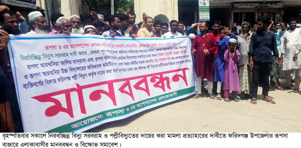 ফরিদগঞ্জের রূপসায় অব্যাহত লোডশেডিং এর কারণে বিক্ষুব্ধ জনতার হাতে পল্লী বিদ্যুৎ কর্মী লাঞ্ছিত হওয়ার ঘটনায় দায়েরকৃত মামলার প্রতিবাদে মানববন্ধন ও বিক্ষােভ সমাবেশ ও মানববন্ধন করেছে স্থানীয় এলাকাবাসী ও ব্যবসায়ীরা।